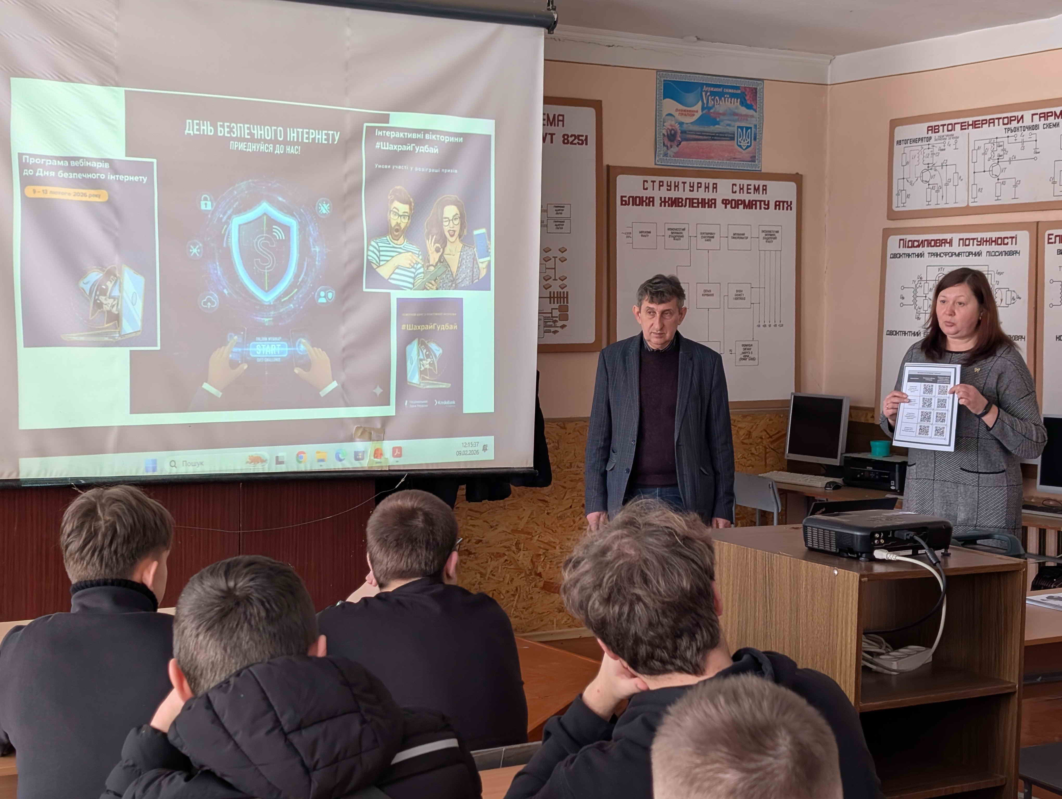Напередодні Дня безпечного інтернету викладачі інформатики Федірчик Любов та Попов Анатолій провели для здобувачів освіти груп № 16 та № 18 тематичні уроки: «Захищай себе та інших онлайн» і «Чому ми тут? Місія 10 лютого». Під час уроків здобувачі освіти пригадали основні правила безпечної поведінки в інтернеті, способи захисту особистих даних та інформаційної приватності. Особливу увагу викладачі приділили питанням платіжної безпеки та формуванню навичок захисту фінансових даних у віртуальному просторі.